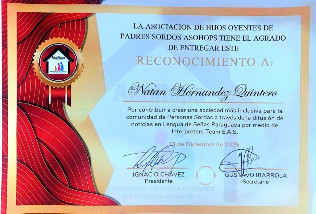 En un acto público de gran relevancia, ASOHOPS Paraguay otorgó un reconocimiento oficial a Natan Hernández, fundador y coordinador general de En Lengua de Señas TV, por su destacada trayectoria en la promoción de la comunicación inclusiva y accesible en Paraguay y América Latina.